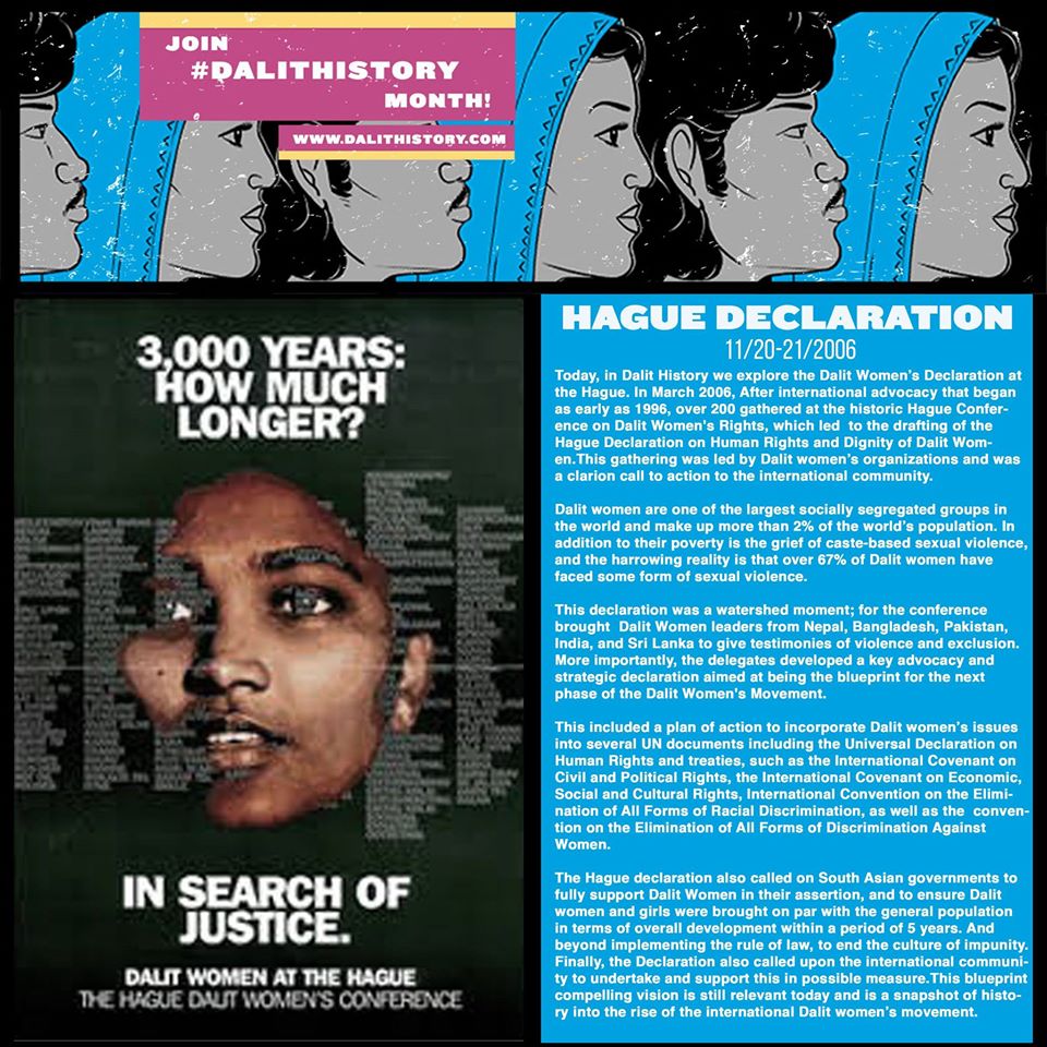Today, in Dalit History we explore the Dalit Women’s Declaration at the Hague. In March 2006, After international advocacy that began as early as 1996, over 200 gathered at the historic Hague Conference on Dalit Women’s Rights, which led to the drafting of the Hague Declaration on Human Rights and Dignity of Dalit Women.This gathering was led by Dalit women’s organizations and was a clarion call to action to the international community.